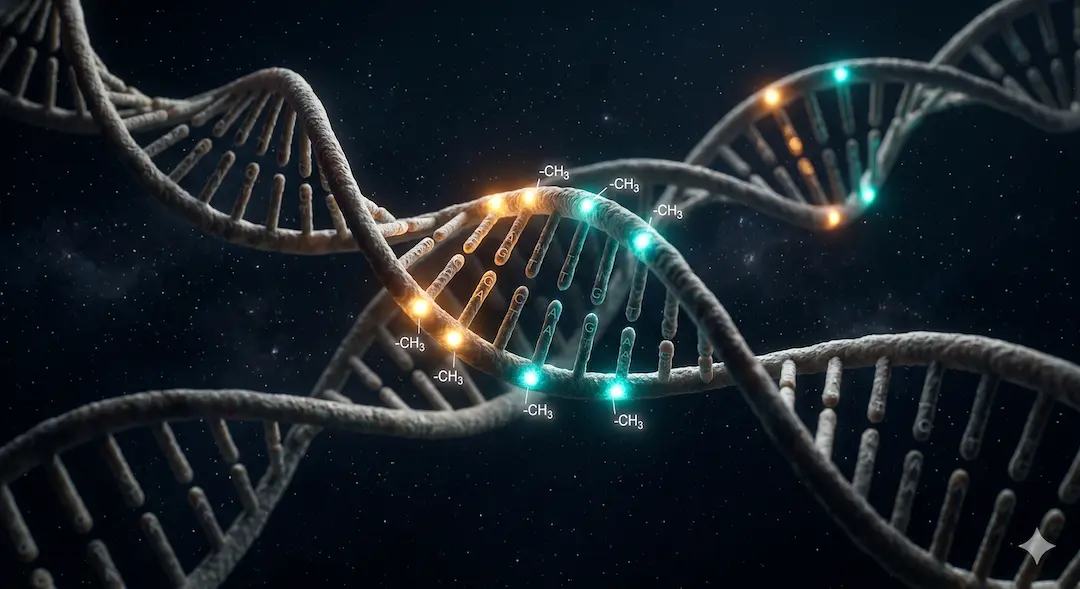 Głównym mechanizmem epigenetycznym jest metylacja DNA: małe grupy chemiczne (-CH₃, tzw. grupy metylowe) przyczepiają się do konkretnych miejsc w DNA – tzw. miejsc CpG (gdzie w sekwencji pojawia się cytozyna sąsiadująca z guaniną). Gdy miejsce CpG jest zmetylowane – odpowiadający mu gen jest zazwyczaj wyciszony. Gdy niezmetylowane – gen może być aktywny. Ten "przełącznik" jest zarządzany przez enzymy i reaguje na środowisko: to, co jesz, jak śpisz, ile się ruszasz, jak bardzo jesteś zestresowany – wszystko to wpływa na wzorzec metylacji milionów miejsc CpG w twoim genomie.